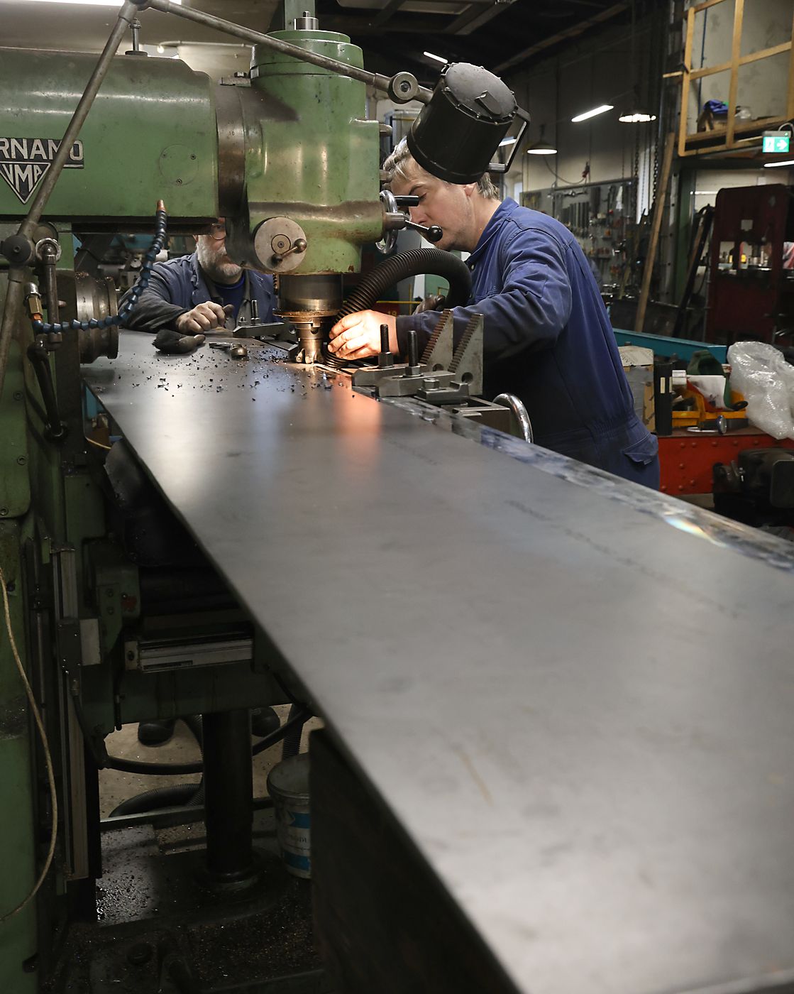 Konstruktören kontrollerar resultatet. Insidan av blivande tanken, i hitkant byggs vinkeljärnet som skall nitas till ovansidan, i bortkant plattjärnet som svetsas till tankbotten och nitas till tanksidan.