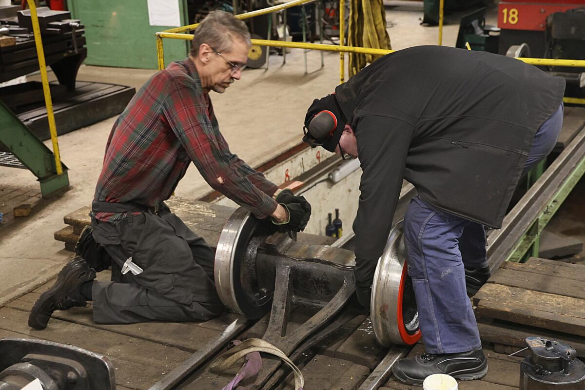 Det som också har renoverats är de ”kronor” de överför lasten från fjädern i huvudramen till den sidorörliga boggiramen. De var slitna i styrningen på mitten och har fått byggas på. Med alla delar klara så var det så dags att montera boggierna.