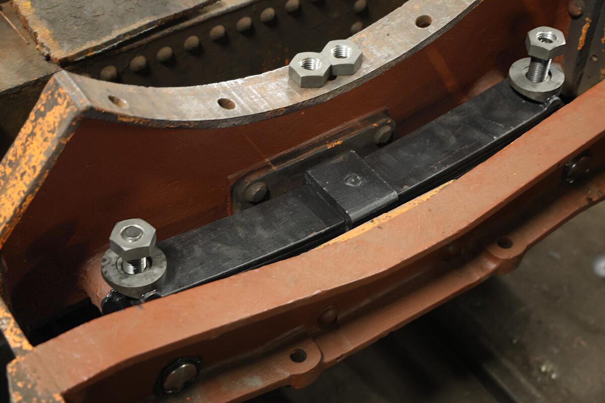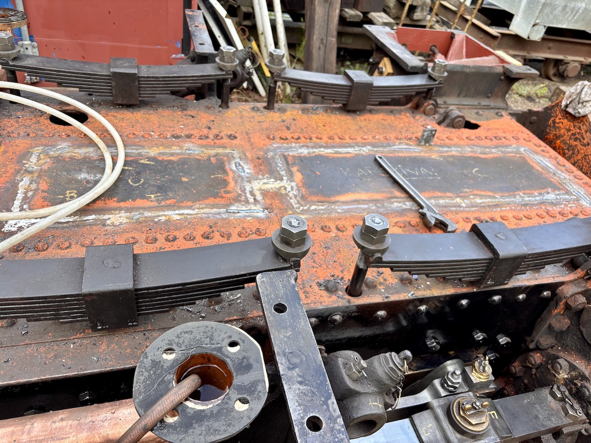 Fjädrar, fjäderstroppar och och deras fästbultar i ramen har helt förnyats på samma sätt som för de drivande axlarna i huvudramen. Det hade varit enklare om vi då kunde har gjort delarna även till boggiaxlarna. Men tyvärr har bultarna i ramen kunnat rotera något och därför slitit upp hålen i ramen en del. Därför svarvade vi nu fyra nya bultar med individuellt anpassade diametrar för att passa exakt i hålen. Därmed fick även hålen i fjäderstropparnas länkhuvuden anpassas individuellt på samma sätt. De fyra länkhuvudena fick sedan skickas på sätthärdning, lite omständligt, men det fungerade. Till fjäderstroppar kunde vi sedan plocka färdiga 7/8″ Whitworthskruvar ur vårt förråd. Från dessa kapade vi bort skallarna och svetsade skruvarna till länkhuvudena.