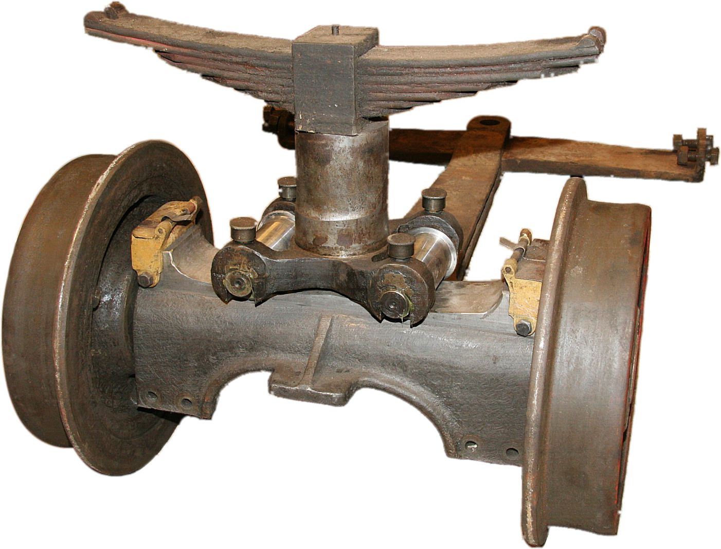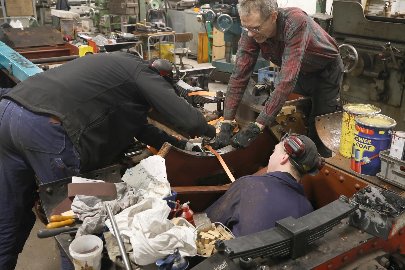 Det som också har renoverats är de ”kronor” de överför lasten från fjädern i huvudramen till den sidorörliga boggiramen. De var slitna i styrningen på mitten och har fått byggas på. Med alla delar klara så var det så dags att montera boggierna.