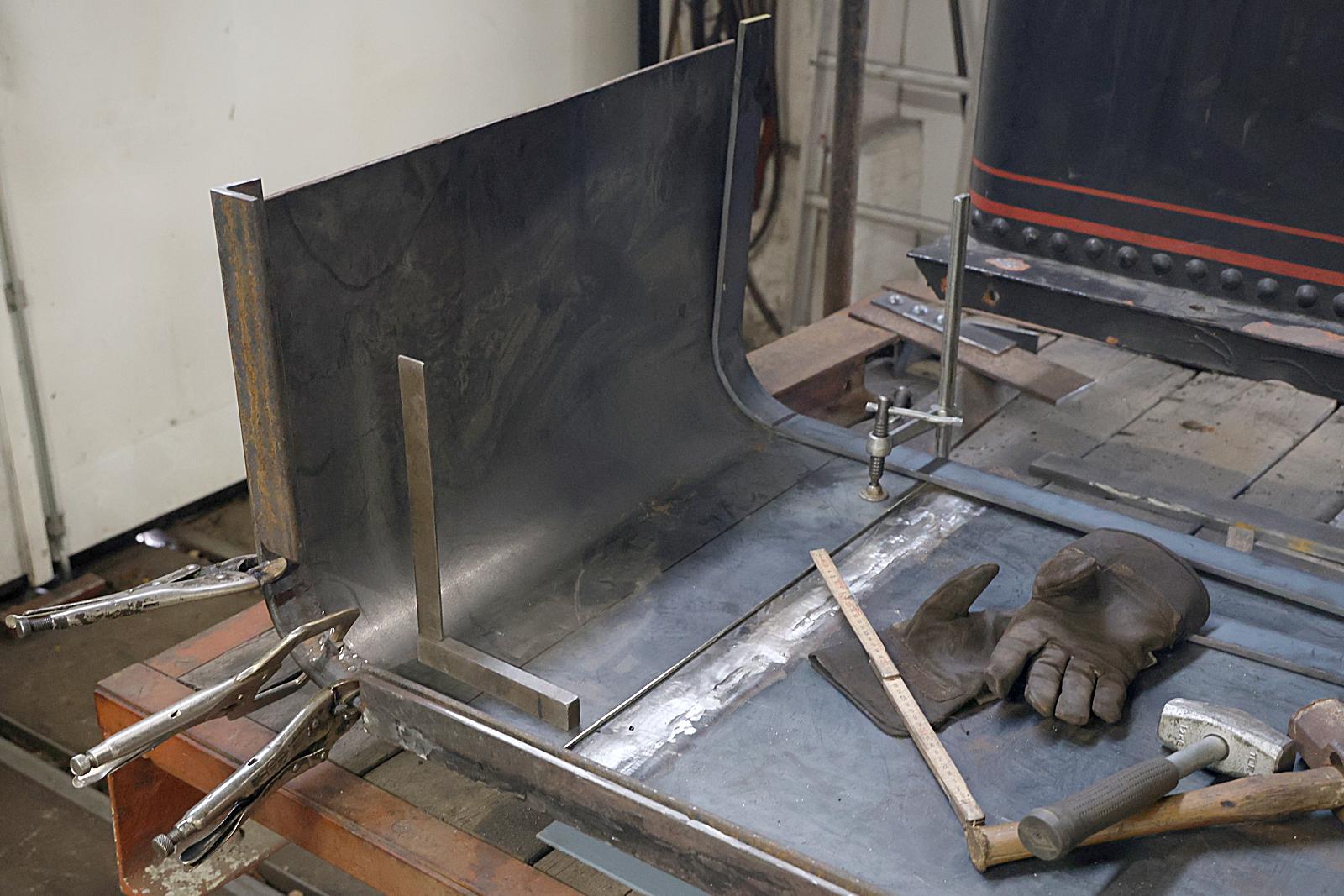 En alldeles speciell utmaning är att bocka tankarnas utsidor med en mjuk böj runt framhörnen. Denna övergång från tanksidor till framgavel är helt avgörande för slutresultatet. Stål kan kallbockas utan uppvärmning, men det fjädrar tillbaka rätt ordentligt. Alltså måste plåten böjas över en mall med en exakt, men betydligt mindre radie än slutresultatet. Först prov med plattjärn av rätt tjocklek för att bestämma mallens radie. Därefter fällde tankprojektledaren Martin ett lämpligt träd på den egna tomten, svarvade en del av stammen till rätt diameter i stora svarven. Runt denna mall byggdes sedan en bockningsgigg som förankrades stadigt i rälsen i verkstadsgolvet. Med många spett och dubbelt så många starka armar kunde så plåten bockas till rätt radie. Slutligen kontroll att vinkeln blev precis 90 grader.